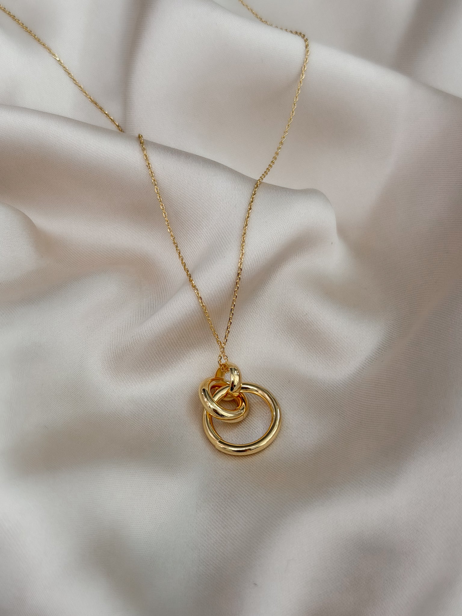 Gold necklace with linked hoop pendant.