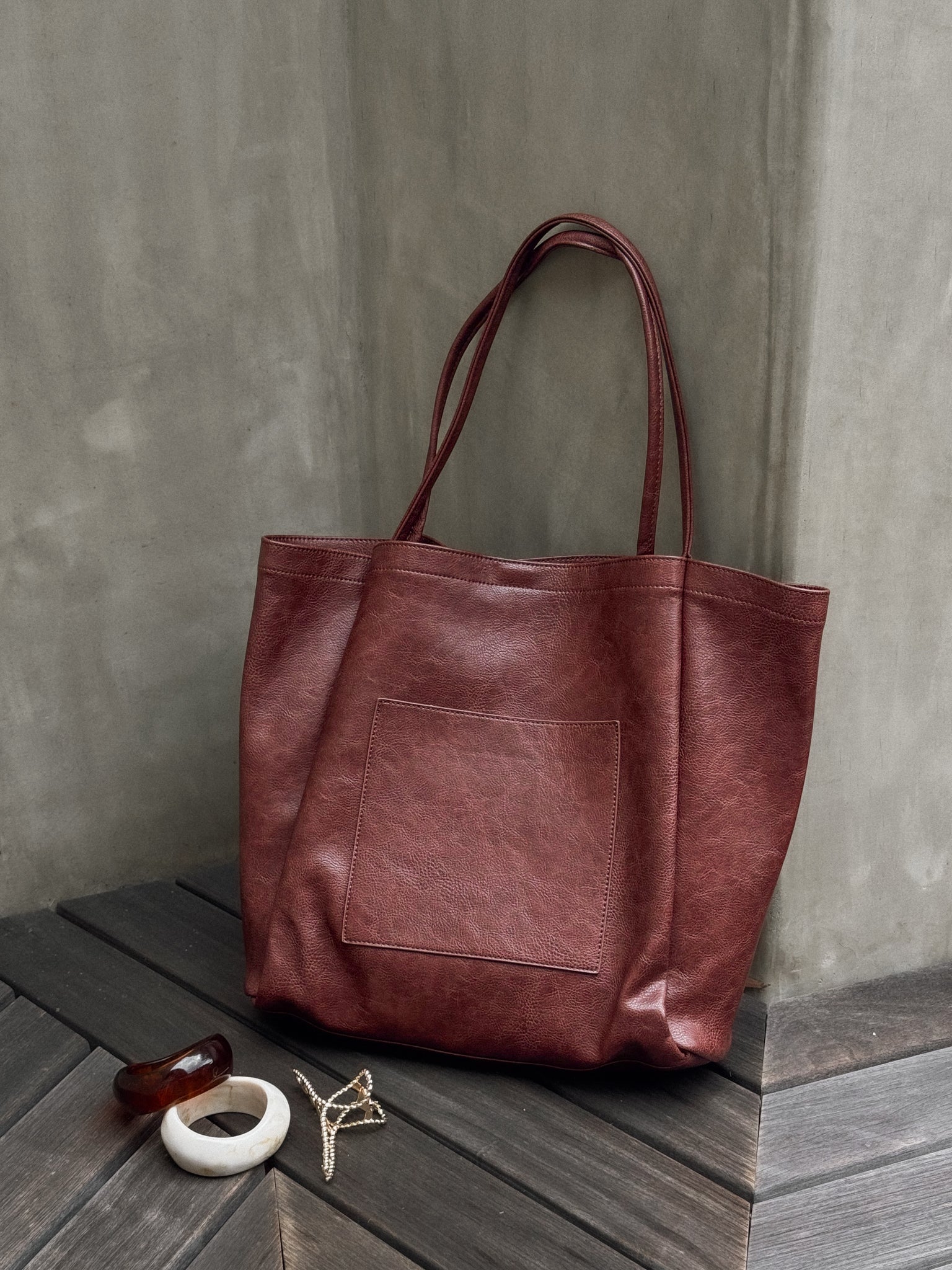 You heard it here first. Oversized totes are IN. This bag has an authentic leather look but is crafted in earth friendly vegan leather then woven in a contemporary style.