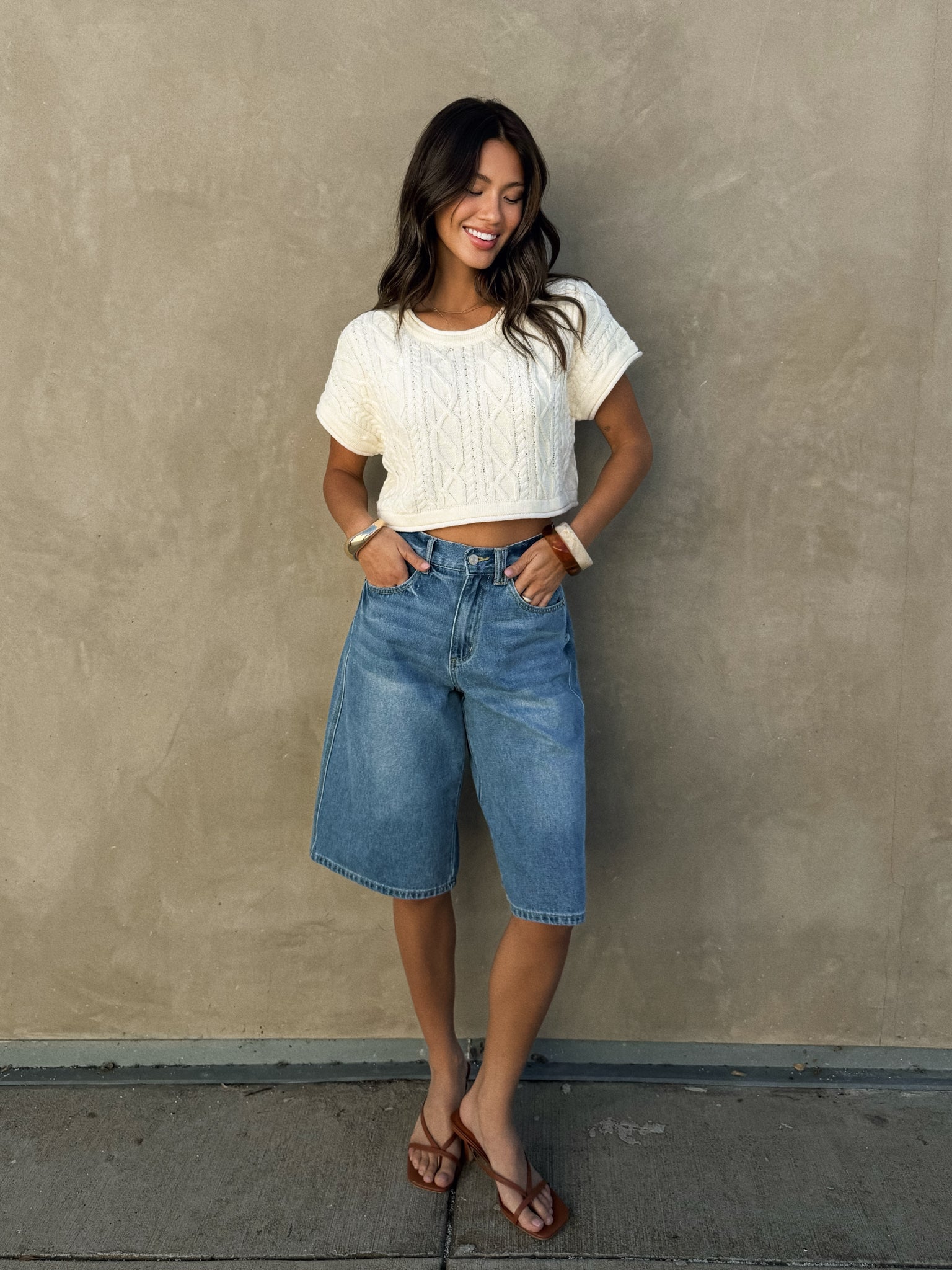 Spring wardrobes aren't complete without a staple white knit top. Pair our Alexia Cable Knit Top with your favorite denim jorts and kitten heels to grab coffee with the girls! Pair with a suede bag and gold jewelry.
