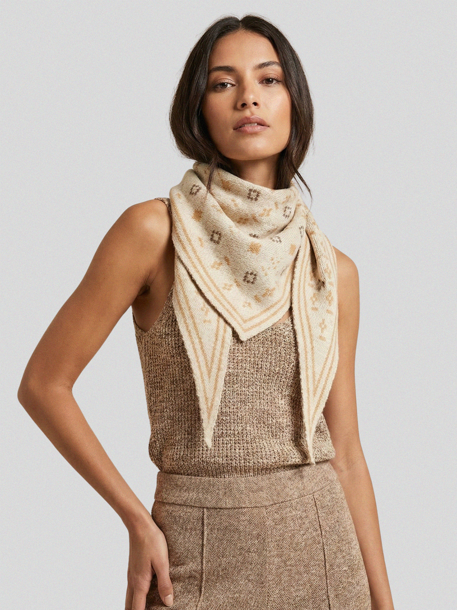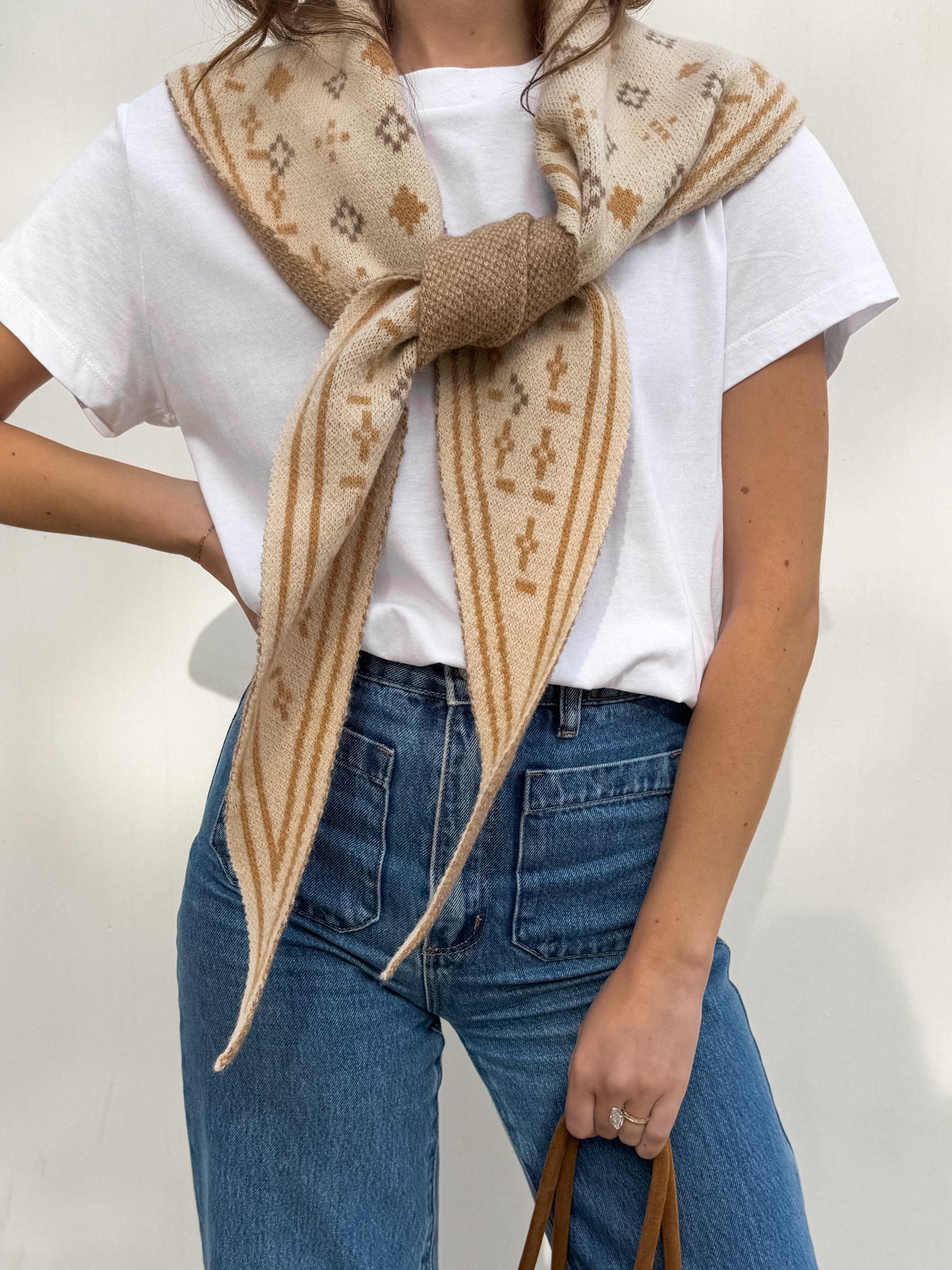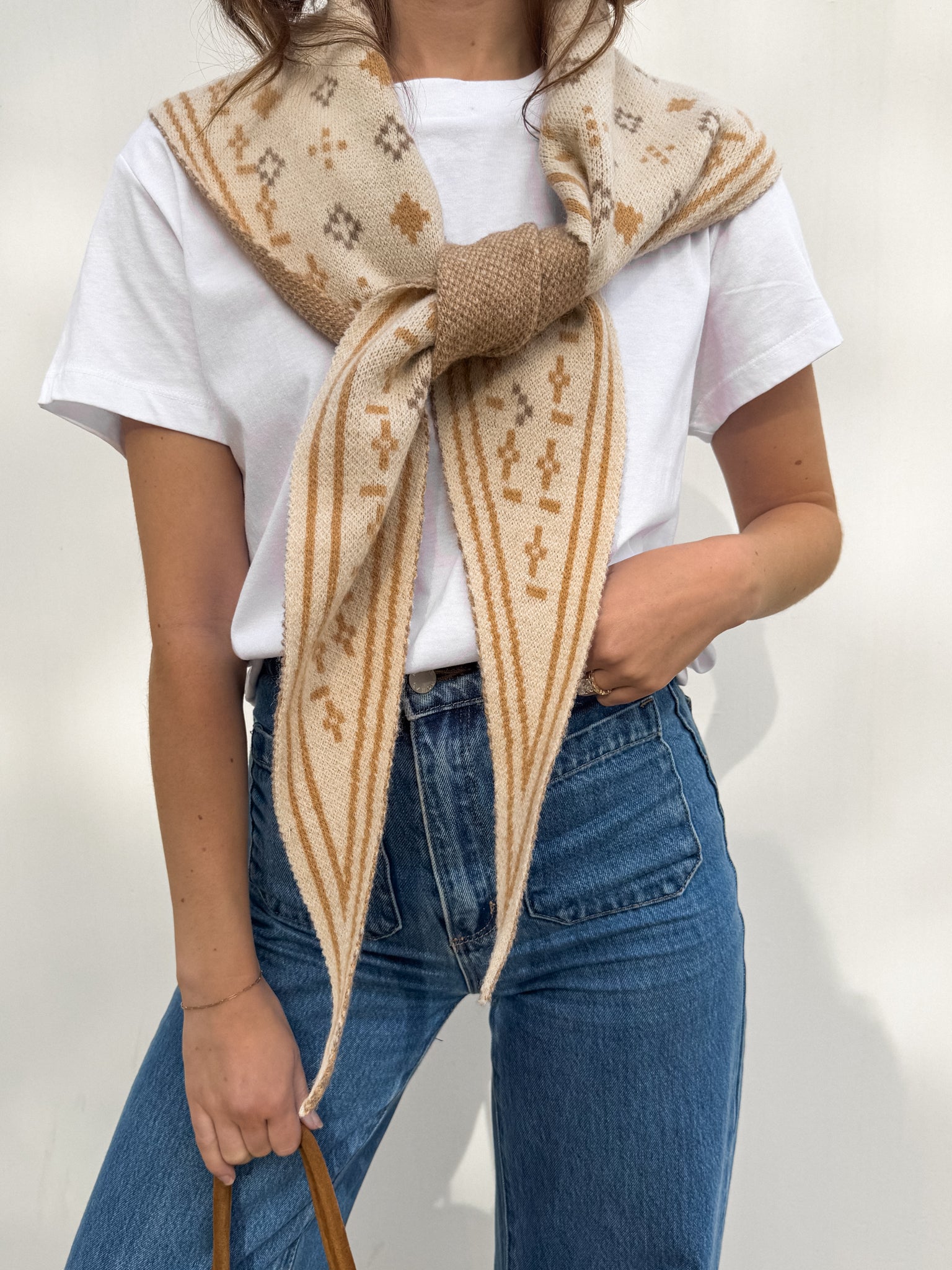 Our Nava Knit Scarf is a must-have accessory for our western, boho lovers. This piece features a triangle, bandana inspired look on soft knit material. Style tied around the neck to spice up any outfit!