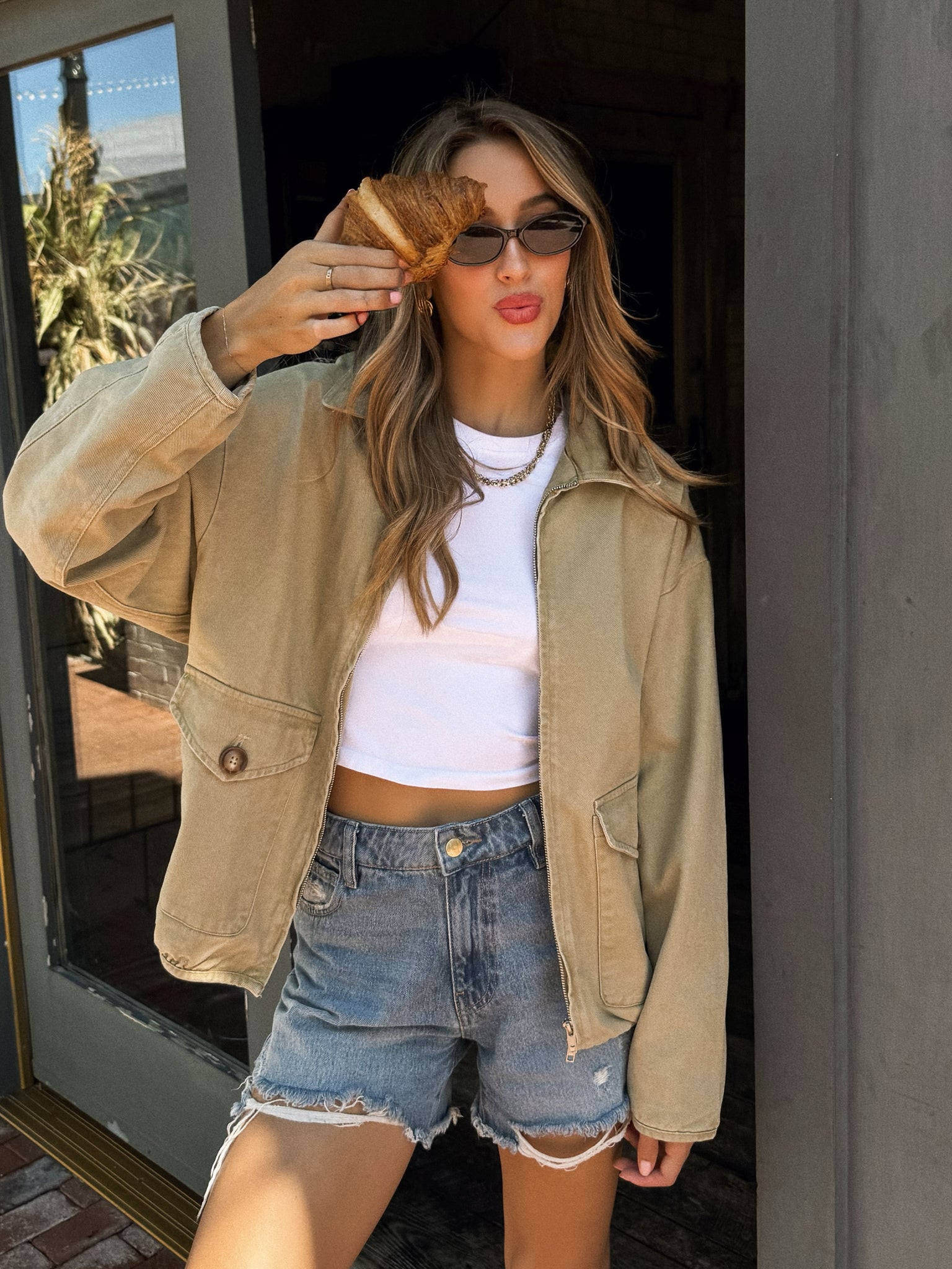From city life to a day on the ranch, our Kenni Barn Jacket is the perfect jacket to add to your outfit this Fall. Style with a white tee and white ruffle shorts for a chic, neutral look.