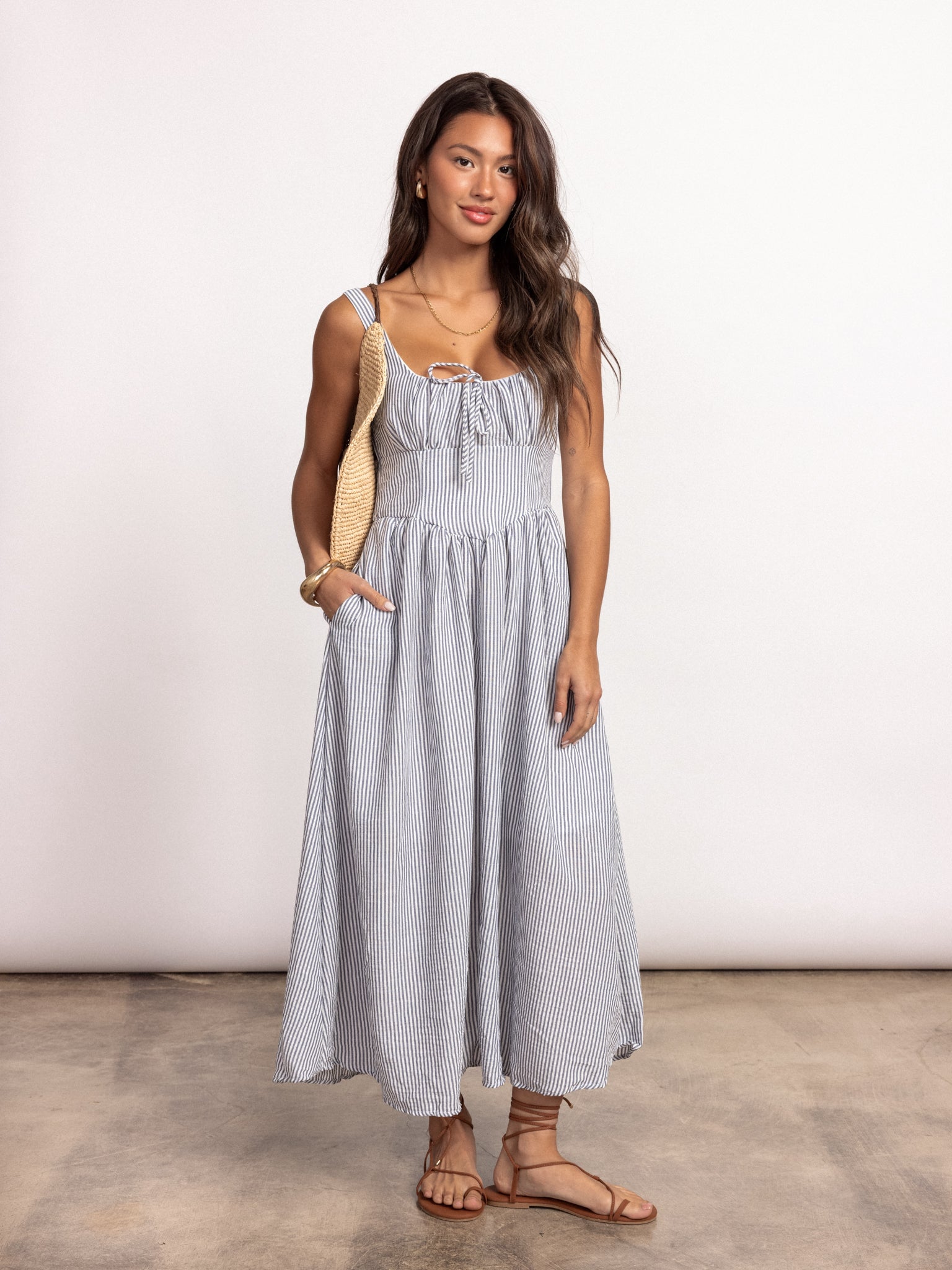 Our coastal summer uniform: stripe dresses. Style our Eleni Stripe Midi Dress with sandals and a cream clutch bag for an effortless, coastal look!