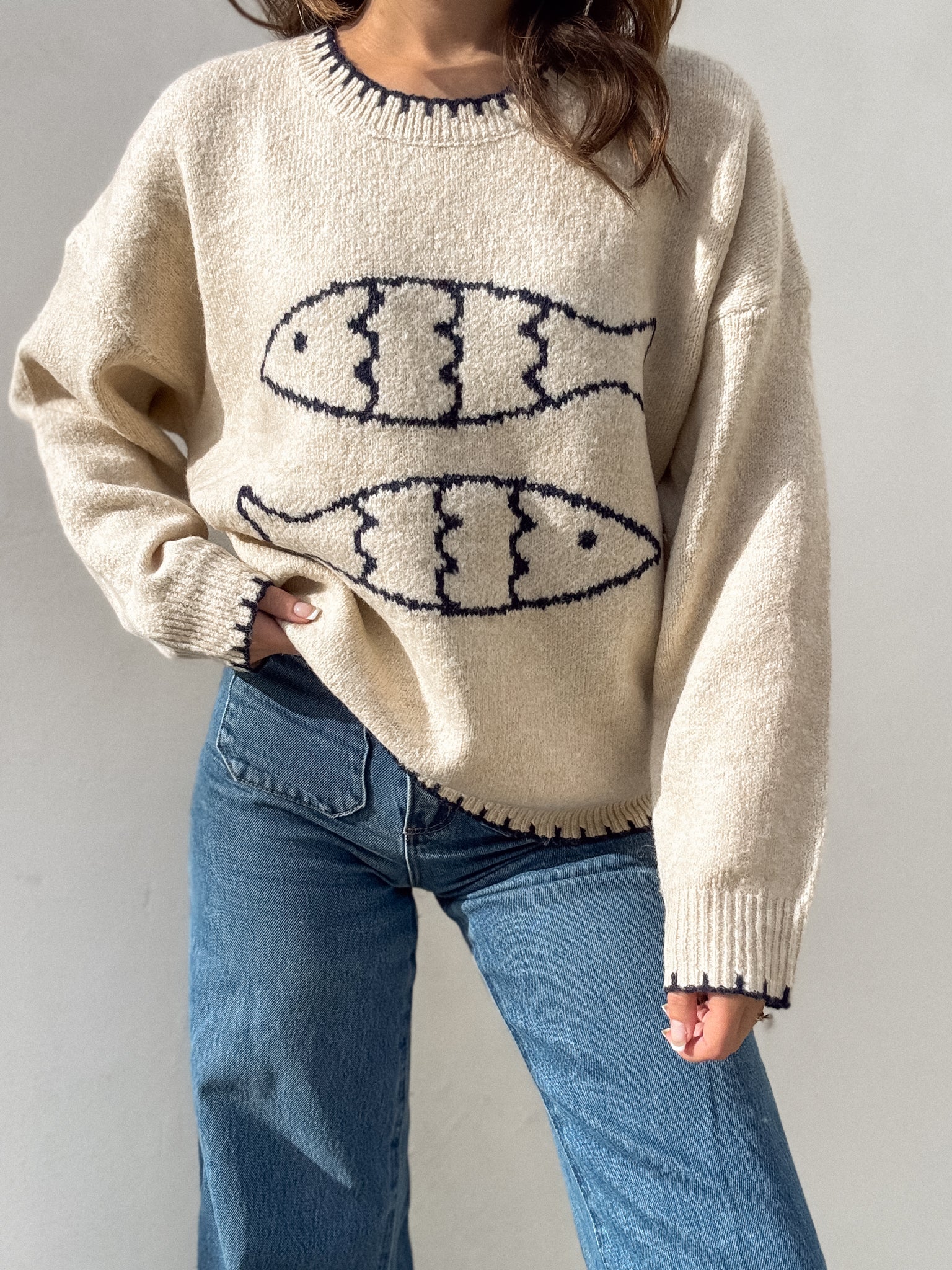 Introducing our NEW Arden Fish Knit Sweater! Style this sweater with white linen shorts and tall brown boots for a relaxed and chic fit. Elevate this look with some gold jewelry and a woven bag.