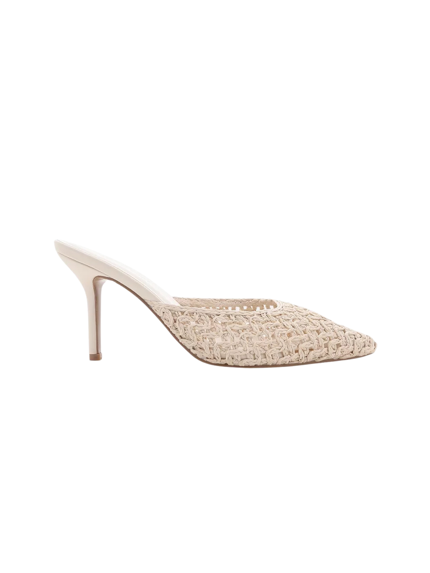 This chic pointed toe mule exudes quiet luxury with its wearable mid stiletto heel, and luxe woven exterior.