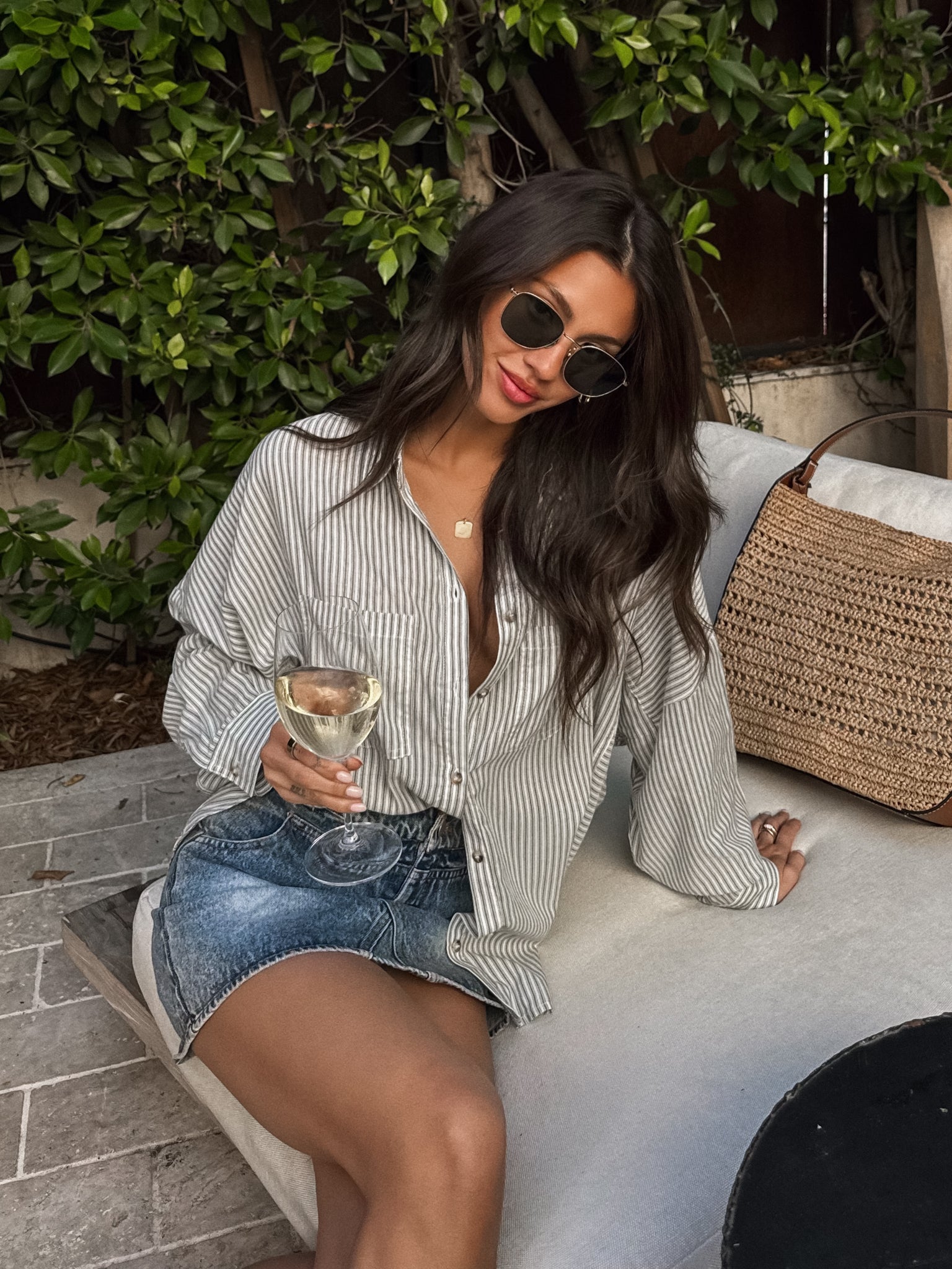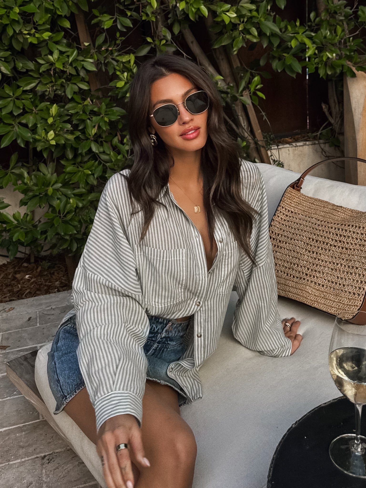 In our stripe era. Pair our Vertigo Stripe Button Down with a denim mini skirt and strappy heels.