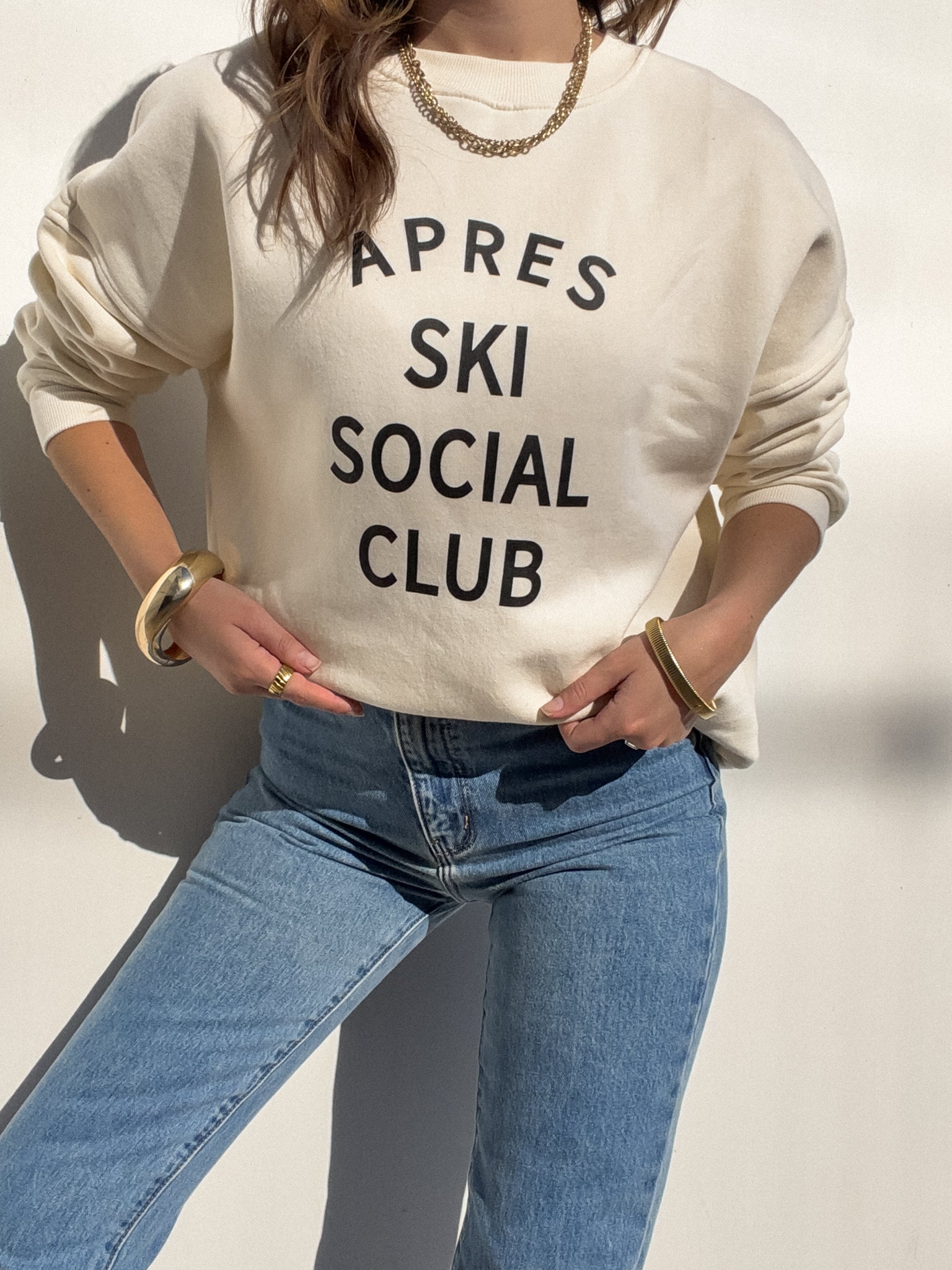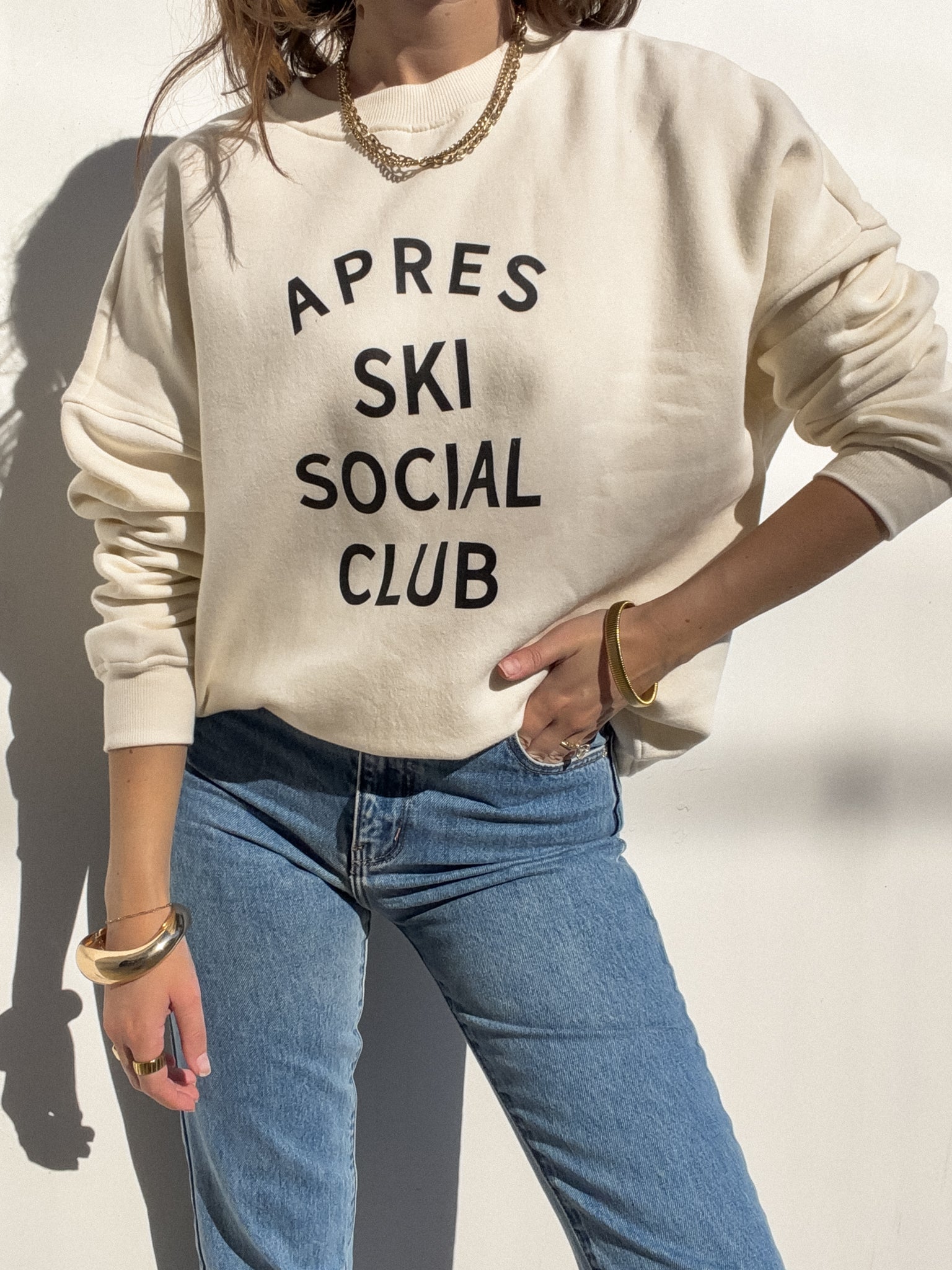 We're just here for the Apres... Introducing our NEW Apres Ski Social Club Sweatshirt! Pair with black leggings and white sneakers for a cute, winter on-the-go look.
