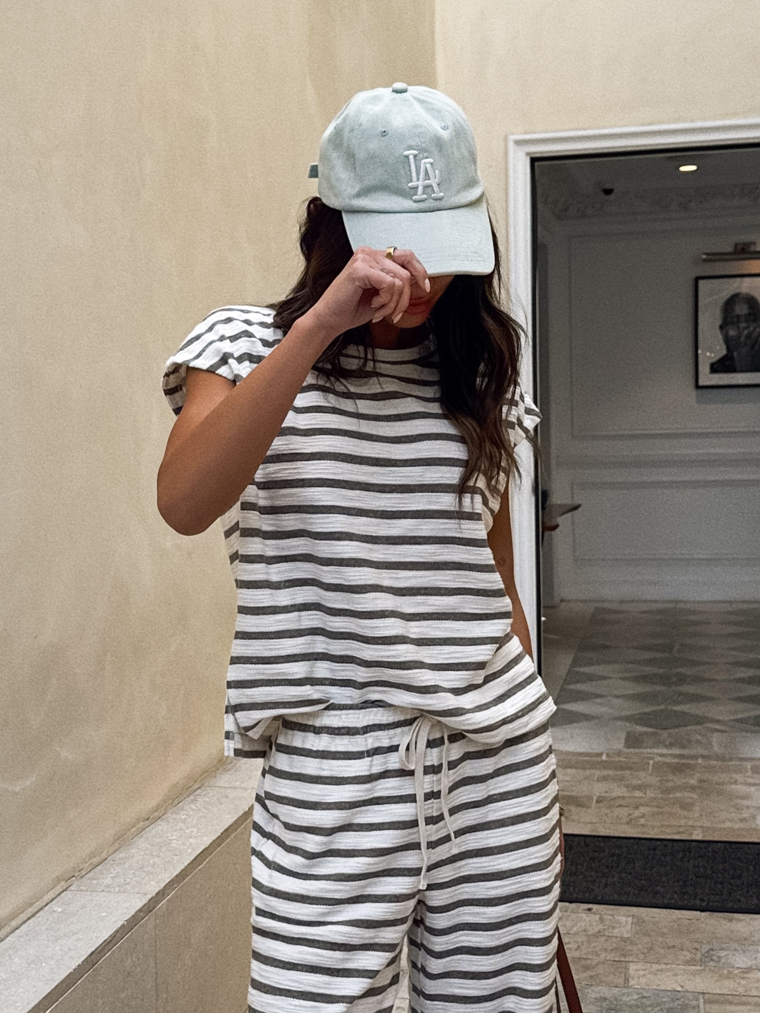 Our goal this spring: wear more stripes. Style our NEW Out and About Stripe Top with our matching pants and sneakers for an effortlessly chic on-the-go look.