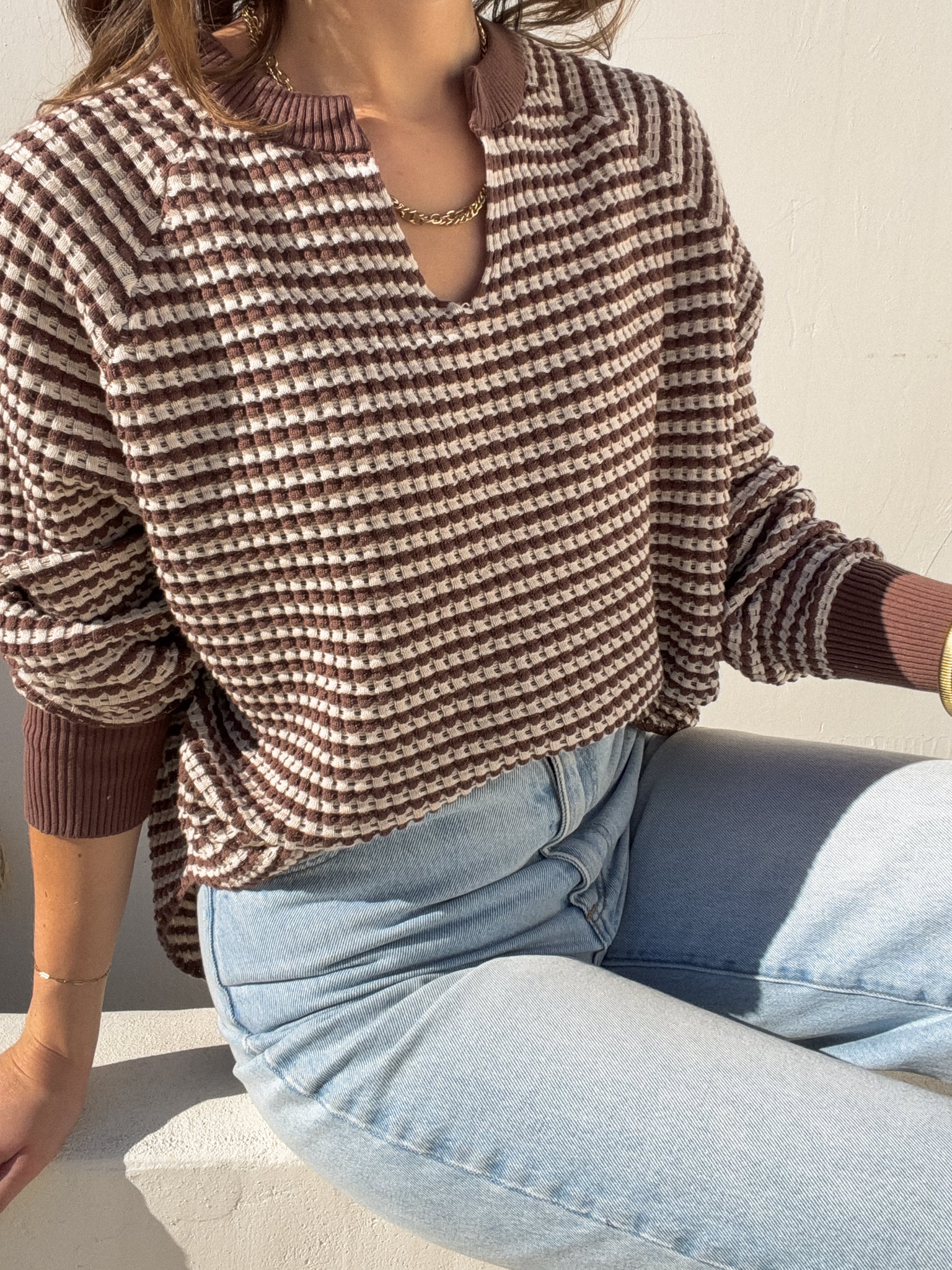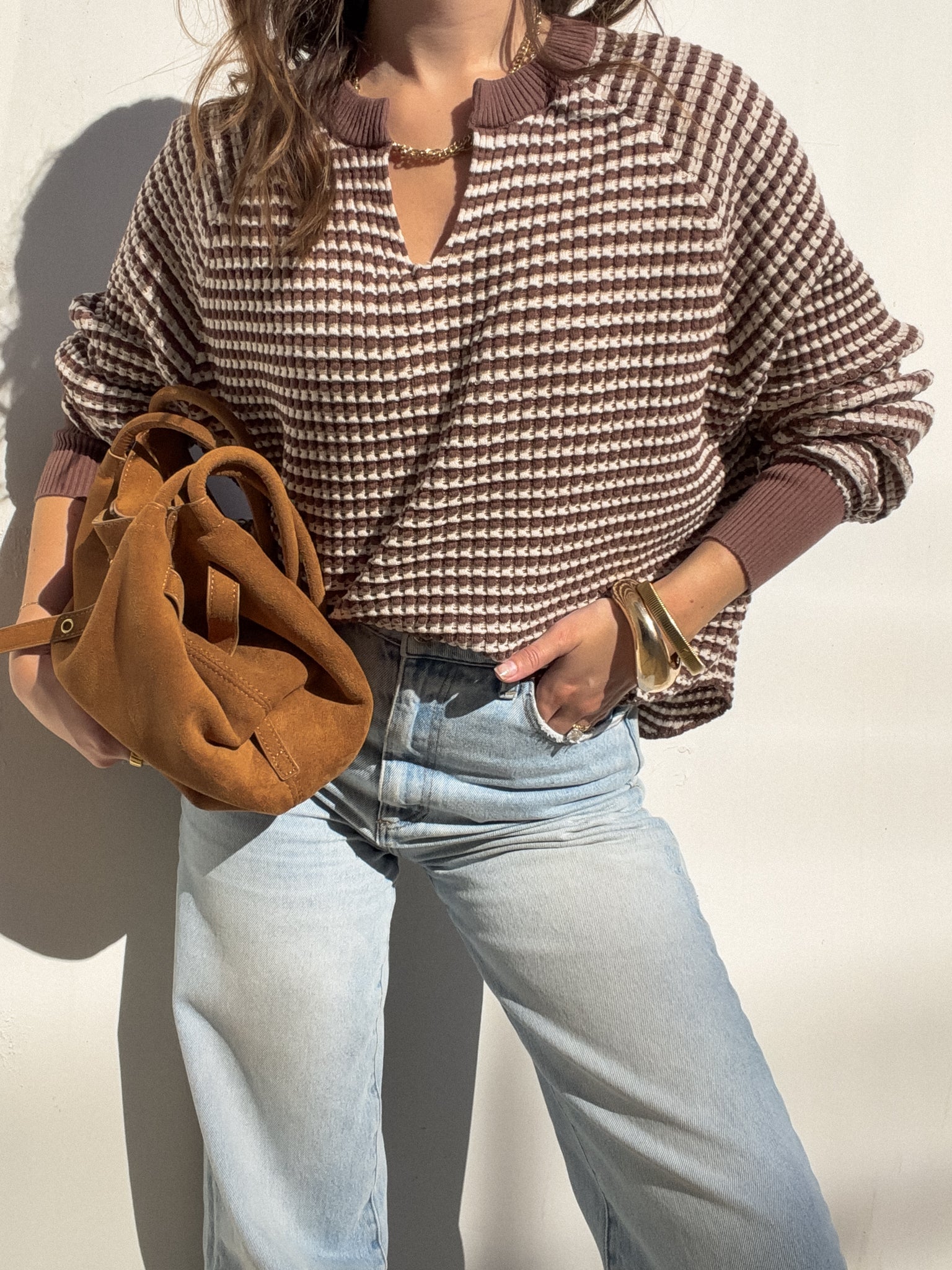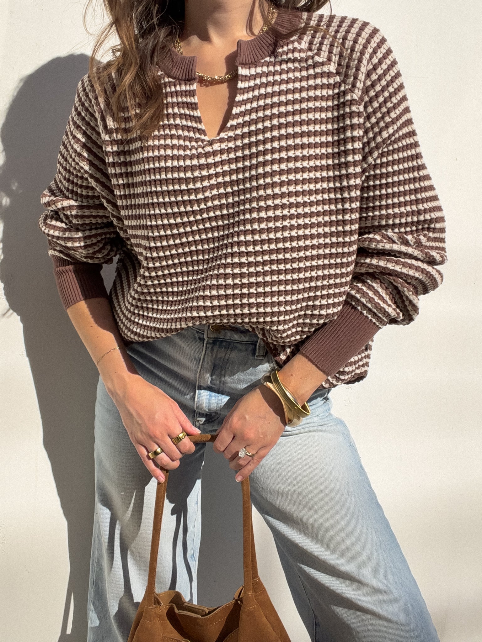 We love a cute and cozy vibe! Throw on our new On the Line Waffle Stripe Top with your fav denim and gold jewelry to complete the look!
