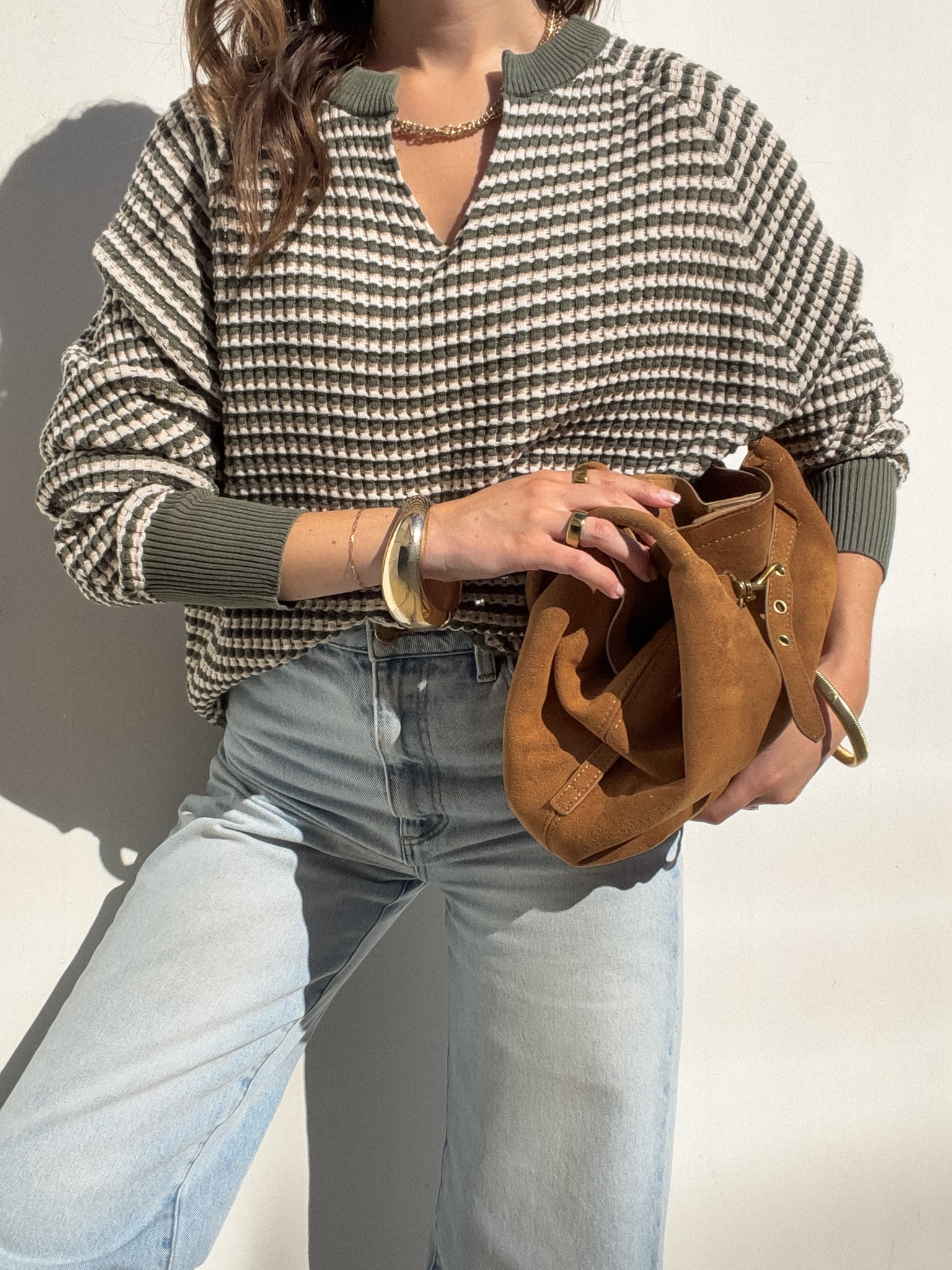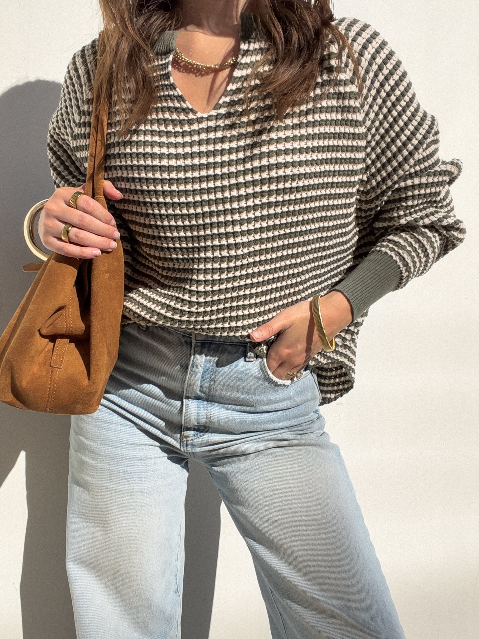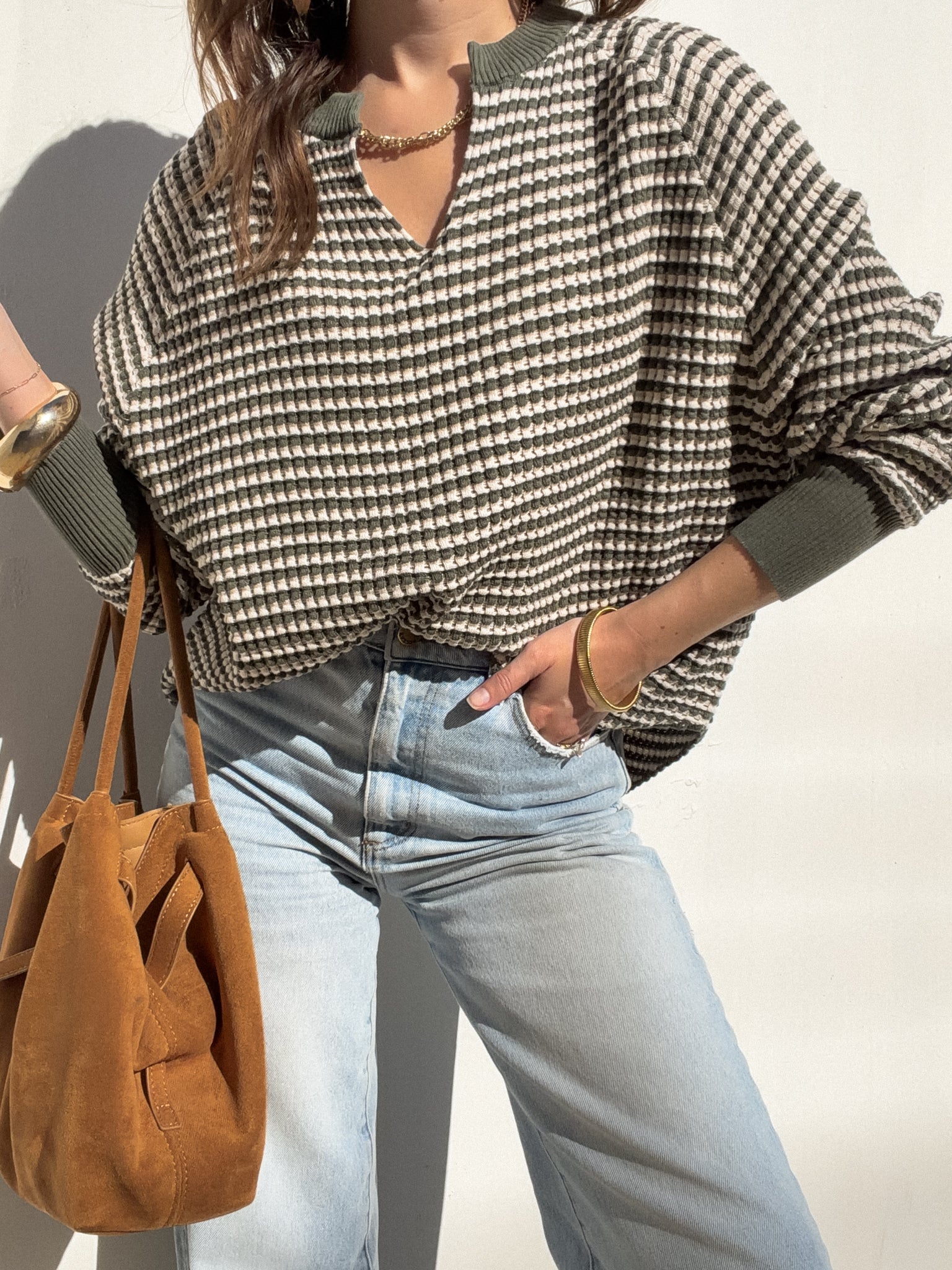 We love a cute and cozy vibe! Throw on our new On the Line Waffle Stripe Top with your fav denim and gold jewelry to complete the look!