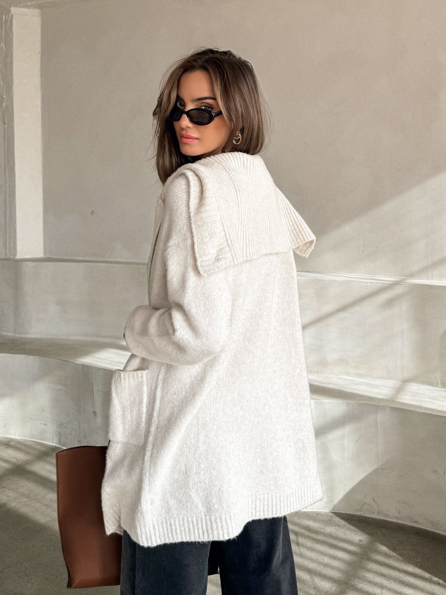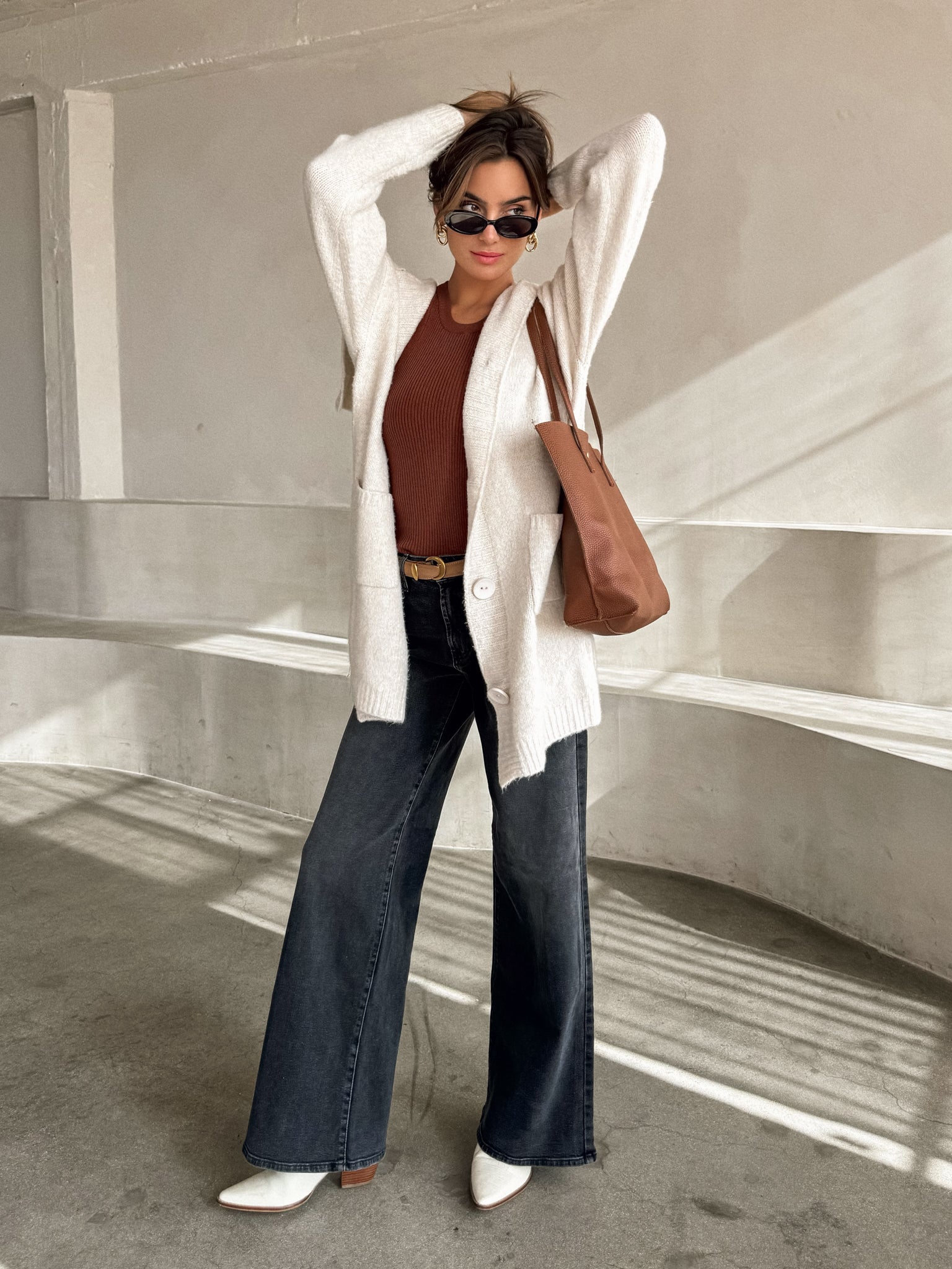 This cardigan is guaranteed to keep you warm and cozy all fall long. Introducing our NEW Alaska Button Knit Cardigan! Style this sweater unbuttoned with a white long sleeve, black leggings, crew socks, and uggs for a cozy evening look! Spice up the outfit with a leather tote bag and gold jewelry for a chic look.