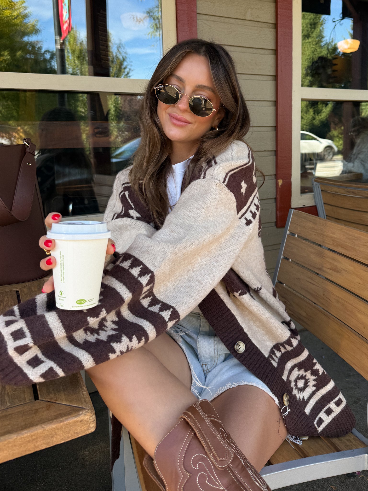 Unfortunately we just can't get enough of western print cardigans. Introducing our NEW Harley Western Knit Cardigan! Style this sweater unbuttoned with a loose white tee, relaxed denim shorts and cowboy boots for an effortless western chic look. Accessorize with brown sunnies, gold jewelry, and a vegan suede bag to complete the fit!