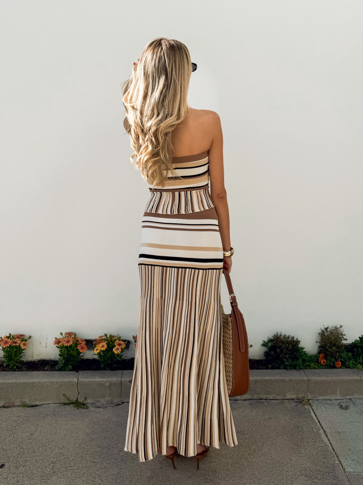 Matching sets will never go out of style. Introducing our NEW Libra Stripe Knit Tube Top! Style this tube top with the matching skirt, brown chunky sandals, and a crochet bag for an elevated fall transitional look! Complete the outfit with gold jewelry and a slick back bun.