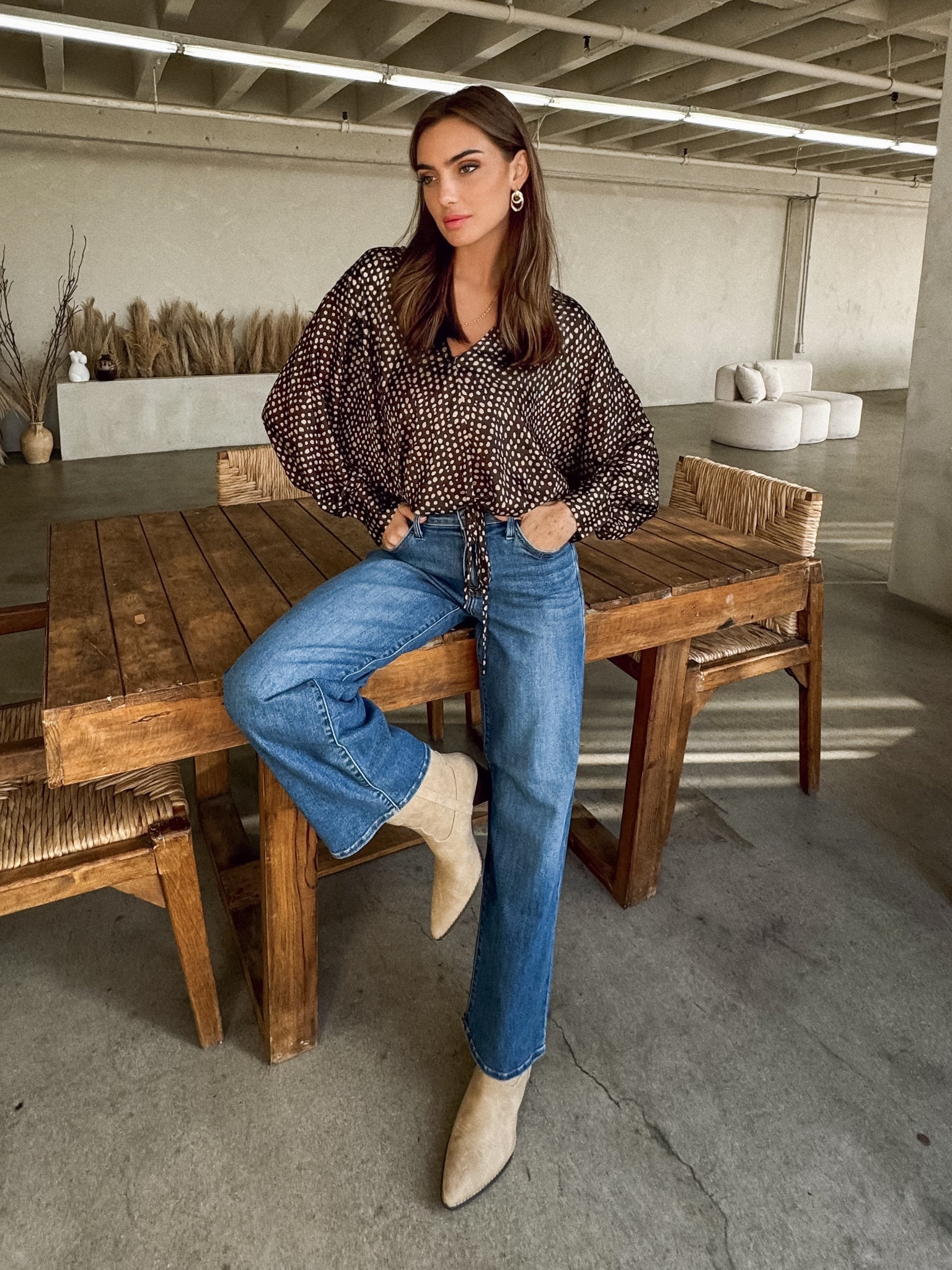 Introducing our NEW Senara Print Surplice Top! This silky silhouette features a spotted print with a surplice detail. Style this top with a white or black tank underneath, black maxi skirt, and black boots for your next night out! Accessorize with gold jewelry and a black mini bag to finish the look.